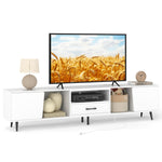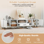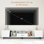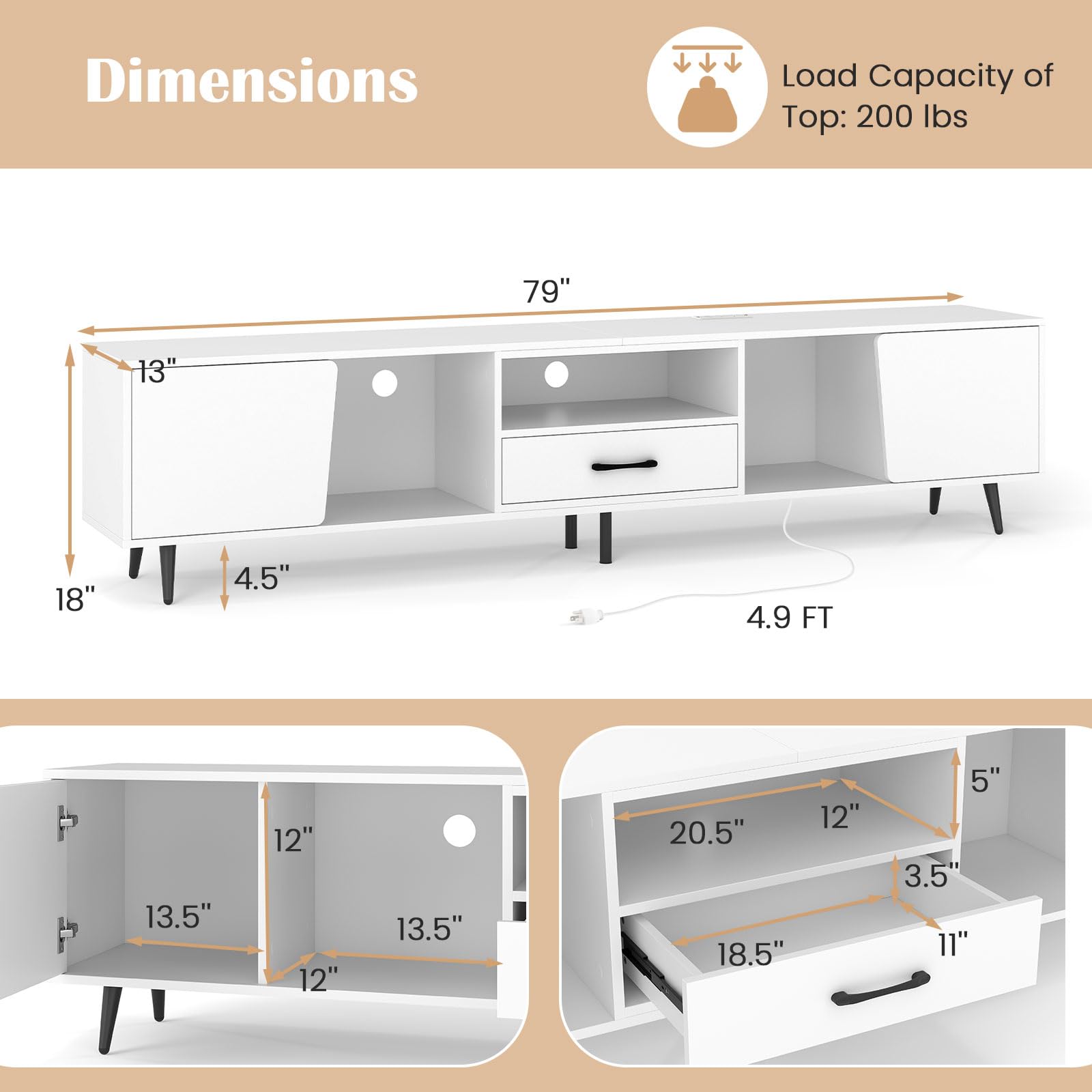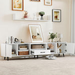 Enhance your viewing experience with this expansive TV stand, accommodating TVs up to 90 inches on its generous 79” length. Organize with ease using dual cabinets, 3 compartments, and a spacious drawer, while 3 cable management holes keep things tidy. Access power conveniently with the built-in strip offering 2 AC outlets, a USB A port, and a USB C port for all your devices. Supported by 6 sturdy metal legs, it can hold up to 420 lbs, ensuring stability. The sleek and modern design makes it versatile for any space, functioning as both a storage organizer and an elegant display stand.