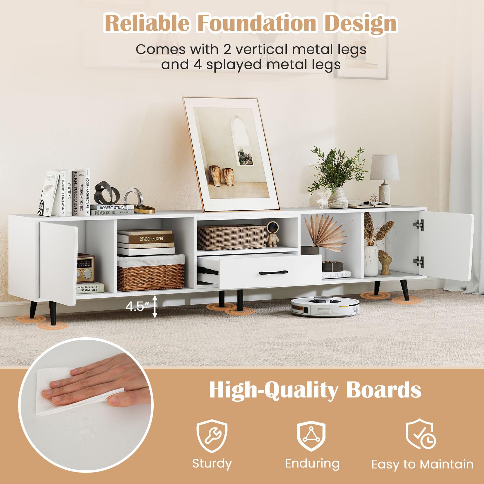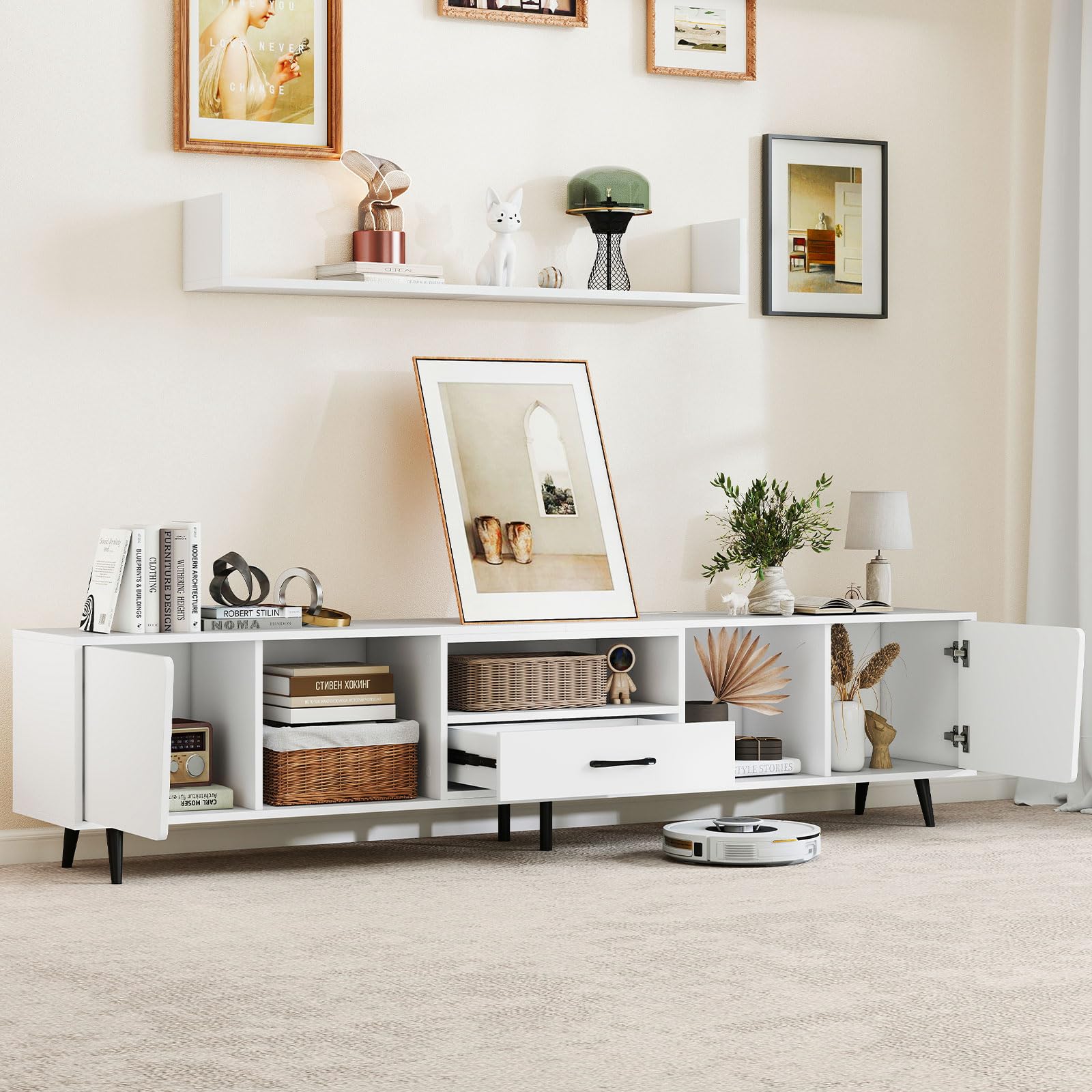Serves as a TV stand, storage cabinet, display cabinet, and more